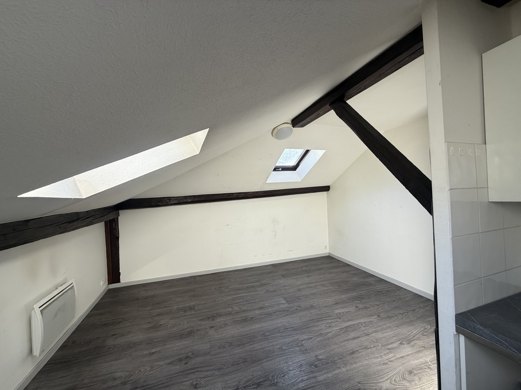 Au quatrième et dernier étage sans ascenseur, cet appartement mansardé se compose d’une entrée, d’une pièce principale lumineuse, d’une grande chambre ainsi que d’une salle de bain avec toilettes.